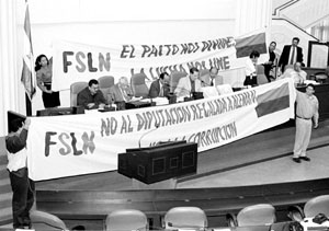 Por el otro lado, el FSLN orteguista acababa de sufrir su segunda derrota consecutiva electoral y había padecido una crisis marcada por la rebelión del Movimiento Renovador Sandinista (MRS), que incluía pérdida de grados de lealtad inalterable de sus cuadros. Estaba, pues, en una etapa vulnerable que trataba de contener con su estratagema de gobernar desde abajo mediante el manejo de huelgas y protestas encaminadas para desestabilizar al gobierno de Alemán.